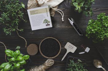 Each kit includes four types of organic seeds (Rocky Mountain Bristlecone Pine, Black Poui, Norway Spruce, and Flame Tree), four biodegradable growing pots, four expanding-soil discs, four bamboo plant markers, one bonsai clipper, and an instruction booklet.