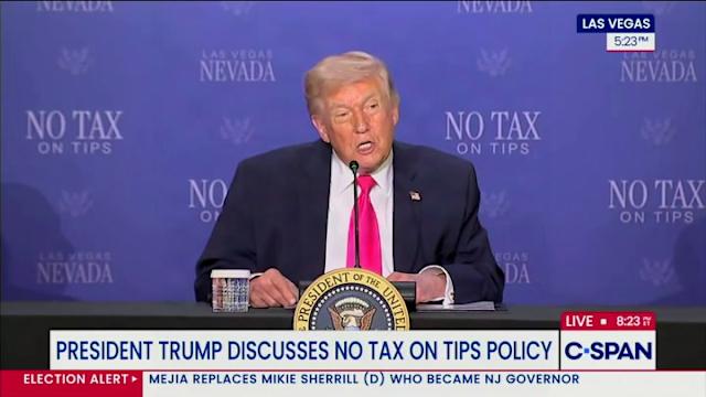 President Donald Trump appeared confounded by a common phrase during a public appearance in Nevada on Thursday. The president was in Las Vegas to promote his “no tax on tips” policy, and was joined by Secretary of the Treasury Scott Bessent and Nevada Lieutenant Governor Stavros Anthony for an event at the AC Hotel. Delivering a speech on the benefits of his policy, which allows employees who receive tips to deduct up to $25,000 in tips when filing their taxes, the 79-year-old came across a term he claimed to have never heard before.