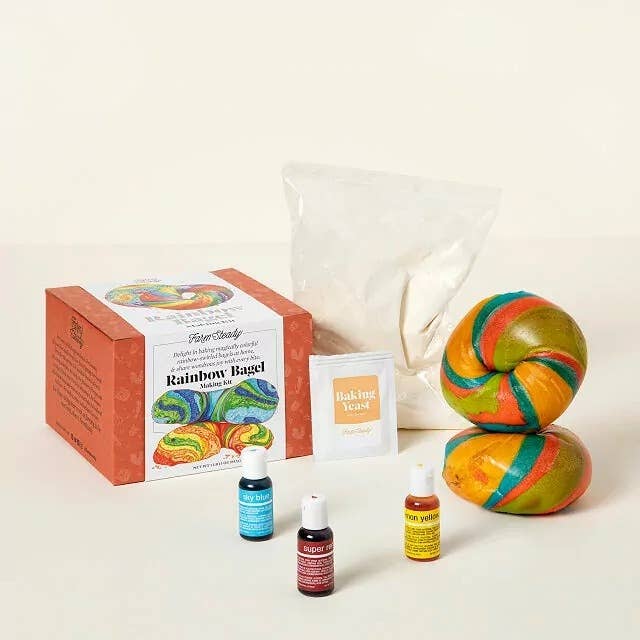 The kit includes bagel mix, yeast, and red, yellow and blue liquid gel food coloring.