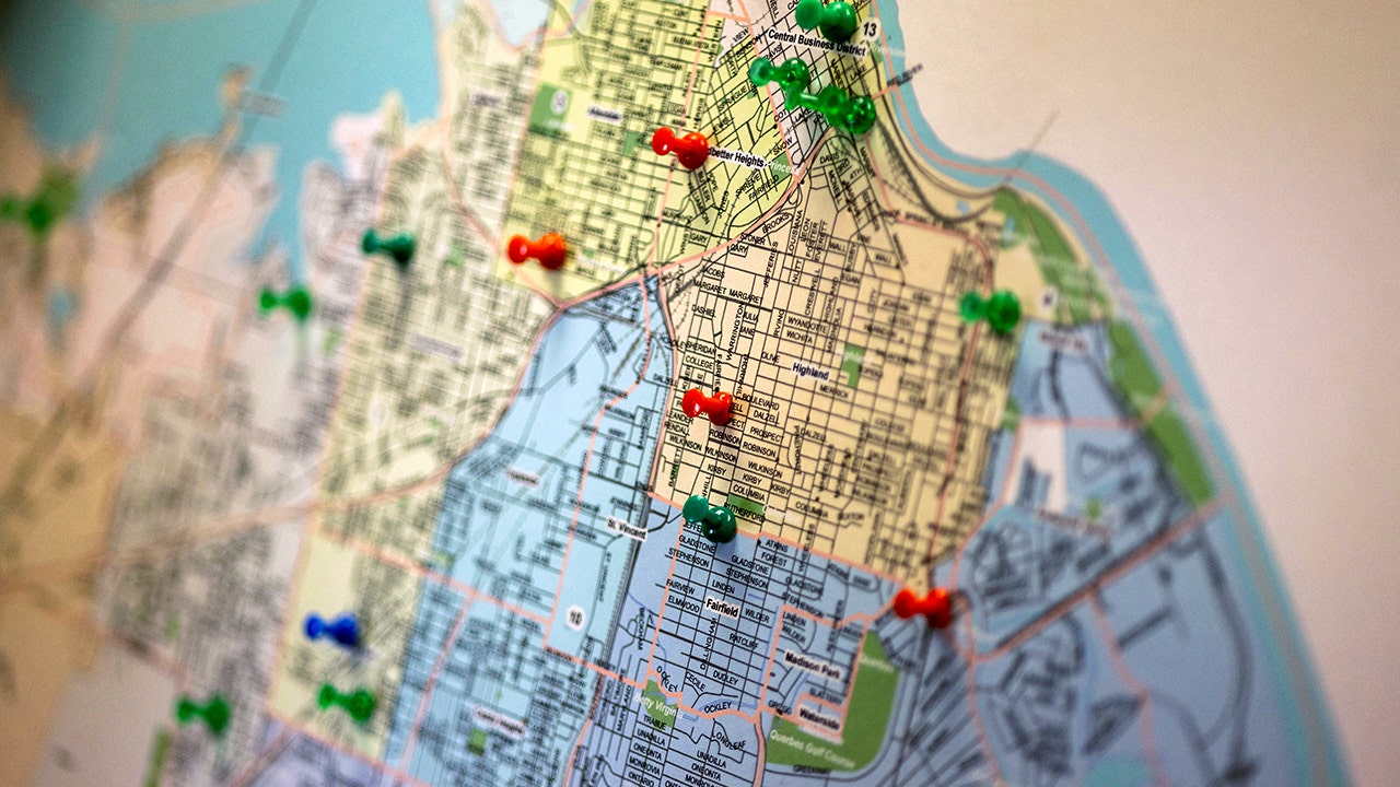 A map of Shreveport, Louisiana, sits in Shreveport Police Chief Wayne E. Smith's office on September 4, 2025, with pins marking areas where murders occurred in 2025. Eight juveniles were killed in a mass shooting in Shreveport on April 19, 2026, following a domestic dispute, police say. (REUTERS/Kathleen Flynn)