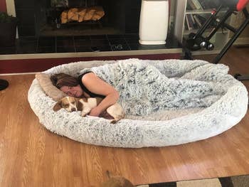 Promising review: "I’ve had this for a few weeks now, and it’s pretty wonderful. I’m a 6’ tall woman, and I can say it’s long enough, and the dogs love it too. I was worried it would shed a lot with the fuzzy strings, but it does not. Extra bonus: the blanket is the neatest thing, with ultra-soft fibers, long and fuzzy on one side and super short on the other. If you need a comfy little nook, get this." —S. Wilson