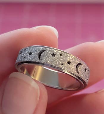 Promising review: "I’m really impressed with the quality of this spinner ring! It spins smoothly and effortlessly, which makes it super satisfying to fidget with. The fit is perfect, true to size, and feels really comfortable on my finger. I also love the moon and stars pattern; it adds a unique and stylish touch that makes the ring stand out. Overall, it’s a great combination of function and design. Definitely one of my favorite rings now!" —Christina Arimboanga