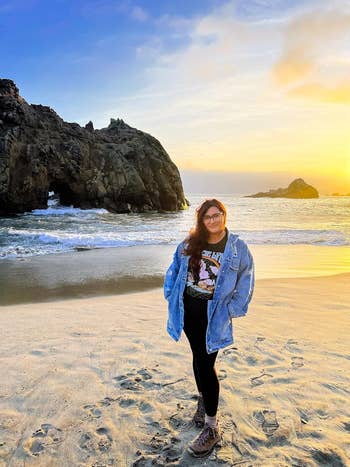 Promising review: "I love this jacket so much! I was hesitant to buy it because I already have a denim jacket, but this was a great addition. Being a longer length gives it a different look that I really like. Super soft and comfortable for travel too. I dressed it up for a night out in San Francisco with a short black dress, and I wore it over a crop top and leggings hiking in Big Sur. The pockets are also huge which is a win for me." —Beck! What the Heck?!