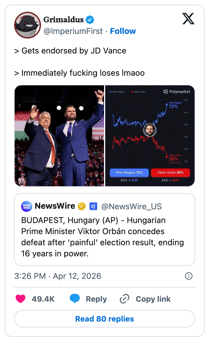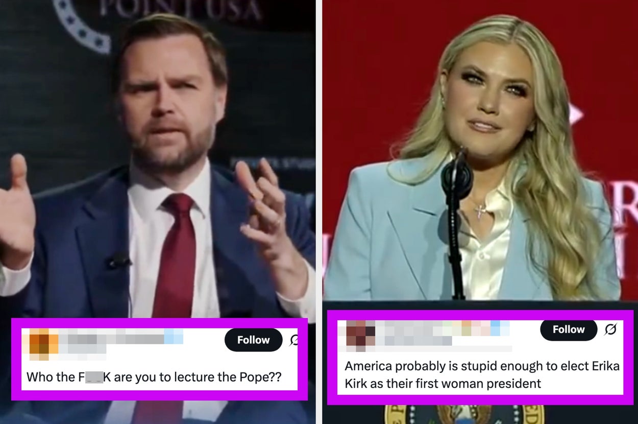 “The JD Vance humiliation tour continues.” I'm the AAPI Culture Editor here at BuzzFeed, where I cover everything from trending news to pop culture to AAPI issues. Editor's Note: While we can't endorse what X has become, we can bring you the worthwhile moments that still exist there, curated and free of the surrounding chaos. The guy who just flew to Hungary to get involved in their politics tells the Pope, who is from Chicago, Illinois to stay out of US politics. https://t.co/wqUadjPHA2 God man even the simplest things about him are just beyond deplorable https://t.co/I4w0nfZo7M Note: The images in the original tweet were replaced here due to photo rights. America probably is stupid enough to elect Erika Kirk as their first woman president https://t.co/gNAgHwMKGh Note: An image in the original tweet was replaced here due to photo rights. Note: The images in the original tweet were replaced here due to photo rights. THIS IS ULTRA SAVAGE 🔥Journalist –– Why do you think President Trump posted that photo depicting Jesus? 🇺🇸 Rep Nancy –– "You should ask a psychiatrist. It needs diagnosis, not conversation" 😂 pic.twitter.com/Xhq3TwcZqA He’s attacking the Pope.He. Is. Attacking. The. Pope. https://t.co/DbveAIyBhw The JD Vance humiliation tour continues https://t.co/Pw7whLWF21 The Atlantic journalist, Sarah Fitzpatrick, who wrote the story on FBI Director Kash Patel and his alleged erratic behavior, paranoia, often being MIA, and excessive drinking, after he threatened to sue her:“I stand by every word of this reporting.”🔥 pic.twitter.com/RPV16WxWjf Who the FUCK are you to lecture the Pope?? https://t.co/gwxUWMap1b Trump is the least popular President in American history.Melania is the least popular First Lady in American history.JD Vance is the least popular VP in American history.Great job America 👏 And on America's 250th Birthday 😔 pic.twitter.com/L7giqDnvzc Note: An image in the original tweet was replaced here due to photo rights. Does he realize what he just admitted lol https://t.co/MXimzOk08k Child: I know your name. Mamdani. Obama: What’s his first name?Child: Mayor. pic.twitter.com/lXIpdt5Yzb “As of today, I no longer consider myself a Catholic”Fox News’ Sean Hannity makes it pretty clear: Trump comes before everything, even over his religion.It’s a cult. pic.twitter.com/3n7P2MRIpJ Need someone like this to run in 2028 not even joking. https://t.co/n2QONUVspC the wife of a deceased podcaster was unavailable to attend our event tonight. please join me in welcoming our backup option for this evening: the vice president of the united states of america https://t.co/YTRroOCHiv For more political tweets, check out our most recent roundup: “I Should Have Been Meaner To You”: After A CHAOTIC Week In Politics, Here Are All The Best Tweets Calling Out This Clown Show