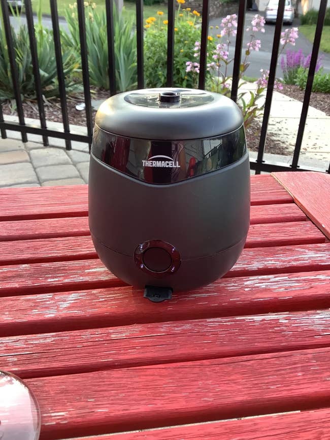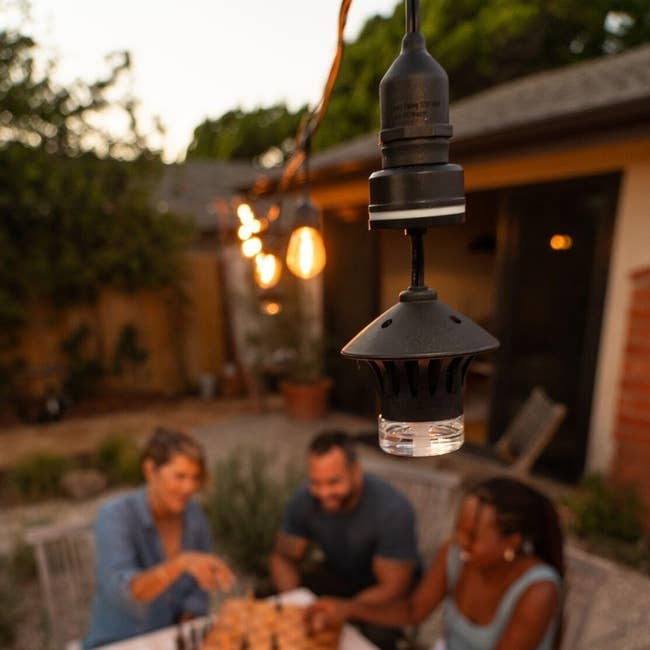 Promising review: "I recently added this plug to my outdoor string lights, and it’s such a simple but great upgrade. It was super easy to install, just plugged right into the lights. We love to host in the summer and frequently grill out and have fires, so having something attached right to the lights to help keep mosquitoes away without having to think about it has been great. Also, love the remote! I like that I can just turn it on when we actually need it and not have it running all the time or feel like it's being wasted when were not out there. Overall, it just makes hanging outside a lot more enjoyable without adding any extra effort." —Piper