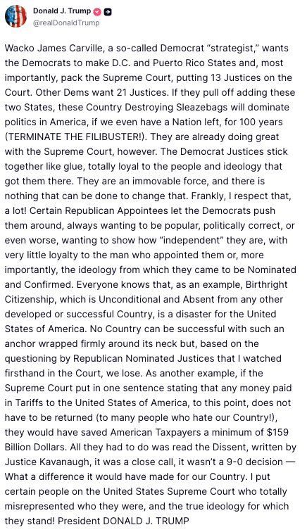 “Wacko James Carville, a so-called Democrat ‘strategist,’ wants the Democrats to make D.C. and Puerto Rico States and, most importantly, pack the Supreme Court, putting 13 Justices on the Court,” Trump wrote. “If they pull off adding these two States, these Country Destroying Sleazebags will dominate politics in America, if we even have a Nation left, for 100 years (TERMINATE THE FILIBUSTER!).”