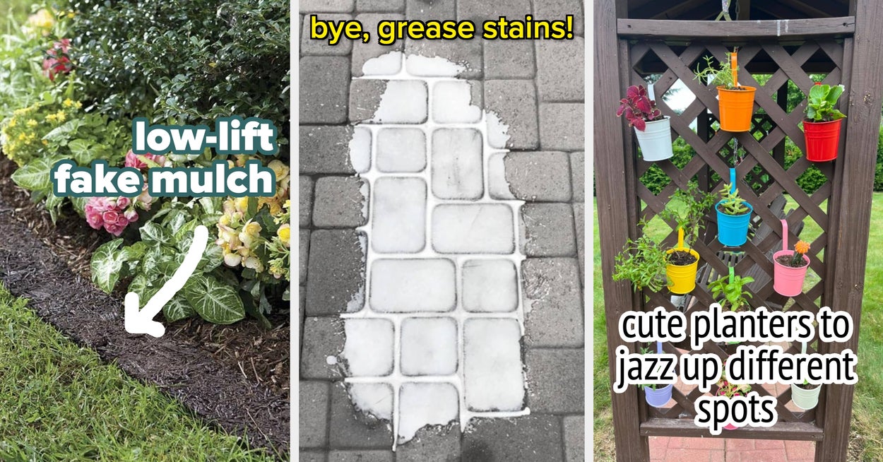 We hope you love our recommendations! While every product is independently chosen by our editors, BuzzFeed and our publishing partners may collect a share of sales or other compensation from the links on this page. You can read more about how our affiliate partnerships work in our Editorial Standards & Ethics Guide. All it takes is a few low-lift tweaks to make you want to clock SO much more time there. Sitting outside at your own place can feel so peaceful. Well, until the sun gets in your eyes or a mosquito gets you behind the knee or your dog starts scratching at the door to go back inside. When it comes to your backyard problems, we've got easy solutions you can accomplish through some very simple DIY-ing. We're talking a magnetic screen door so Miso can let herself back inside, some food-proof covers for your picnic table that can legally drink, and even an outdoor rug you can simply throw down on a worse-for-wear patio surface you don't have the time or energy to paint. (Though a bit of concrete paint does go a long way.) 'Tis the time to handle these beginner-friendly home improvement projects so you can hurry up and start using your backyard to its full potential! Promising review: "I wanted to wait until the grass had a chance to grow before leaving my review, and I’m very pleased! The germination rate was quick, the grass came in thick and healthy, and it’s already looking great in my yard. Easy to plant, grows strong, and definitely worth it. Highly recommend if you want reliable results!" —Richard lademan Get it from Amazon for $23.67 (also available in two other bag sizes). Made with a bamboo handle and powder-coated steel, it uses a simple lever system to made weeding easy. Grampa's Weeder is a small biz! Promising review: "Oh my god, I friggin' love this tool. I bought this on a whim given we bought our first house and know nothing about caring for a yard. Boy has it come in handy. Our new house had a ton of weeds in the front yard and this tool helped me get most of them out in no time. In fact, the process of yanking out the weed was strangely satisfying! I don't think anyone can say that weeding is fun but this tool made it as close to fun as you can get, especially when you see a long root along with the weed you pulled." —JG My colleague Sally Elshorafa invested in this tool and LOVES it: "After moving to the East Coast, I quickly learned that the stone pathways around my home are basically a spa retreat for moss and weeds. The cracks collect moisture, trap organic debris, and offer *just* enough shelter to help unwanted greenery flourish, especially with all the shade and rain we get. I didn't want my outdoor space to turn into a jungle, so I grabbed this tool and got to work. It's weirdly satisfying — kind of like flossing, but for your stone paths. The bent tip slides right into the cracks and pulls weeds out from the root, which helps keep them from coming back anytime soon. I've used it on my pathways, driveway, and anywhere else something tries to sprout where it shouldn't. The handle is comfortable, and it doesn't take much effort to use. It's quickly becoming one of my favorites. If you've got hardscaping, you need this in your toolkit." Promising review: "I love spending time outside, and we entertain on our patio, too. But when it's over 100 degrees outside, nobody feels like visiting. Until now!! I bought one and liked it so much I ordered another to cover both patios. They lower the temps to a more moderate level in just moments and don't use a 100 gallons of water doing it! I put mine along the top of our privacy fence and then put a fan in behind it and made it almost like having an AC unit outside. They're easy to put up and take down and come with convenient hanging hooks! I read the reviews people wrote about the heads getting stopped up, and they WILL, but as a plumber I'll tell you a trick to keeping them working like new: vinegar. Just remove the heads and soak then in a little straight vinegar then use a small bristle brush like a toothbrush or nail brush rinse them off and replace them in the mister tubing, and they should be like brand new." —Sonya Combs Get it from Amazon for $21.20+ (available in several pack sizes). Promising review: "I went in skeptical, I'm not going to lie. We had grease spilled on our brand-new paver patio. The grease had been sitting for a few weeks, and I saw an ad for this stuff. I ordered it to try because why not? Well, I'll be damned because this took the spots right off! No evidence we ever spilled anything! I'd buy it again." —Susan Reviewers note that you should remove the bulbs before stringing up the strands and then install the bulbs. Promising review: "These lights were perfect for my patio, I've recieved plenty of compliments so far. The Edison light bulbs and beautiful and offer the perfect amount of lighting for any occasion...the clips were ideal for my eaves, the overhang of the roof, which made for simple installation...now just need to find a dimmer capable of handling the required wattage and the package will be complete." —Brody Vins Get a strand from Amazon for $14.79+ (available in six styles and lengths). Consider stocking up on a two-pack of refills for $19.99. Promising review: "I recently added this plug to my outdoor string lights, and it’s such a simple but great upgrade. It was super easy to install, just plugged right into the lights. We love to host in the summer and frequently grill out and have fires, so having something attached right to the lights to help keep mosquitoes away without having to think about it has been great. Also, love the remote! I like that I can just turn it on when we actually need it and not have it running all the time or feel like it's being wasted when were not out there. Overall, it just makes hanging outside a lot more enjoyable without adding any extra effort." —Piper Promising review: "These lights were just the thing to finish off our ne