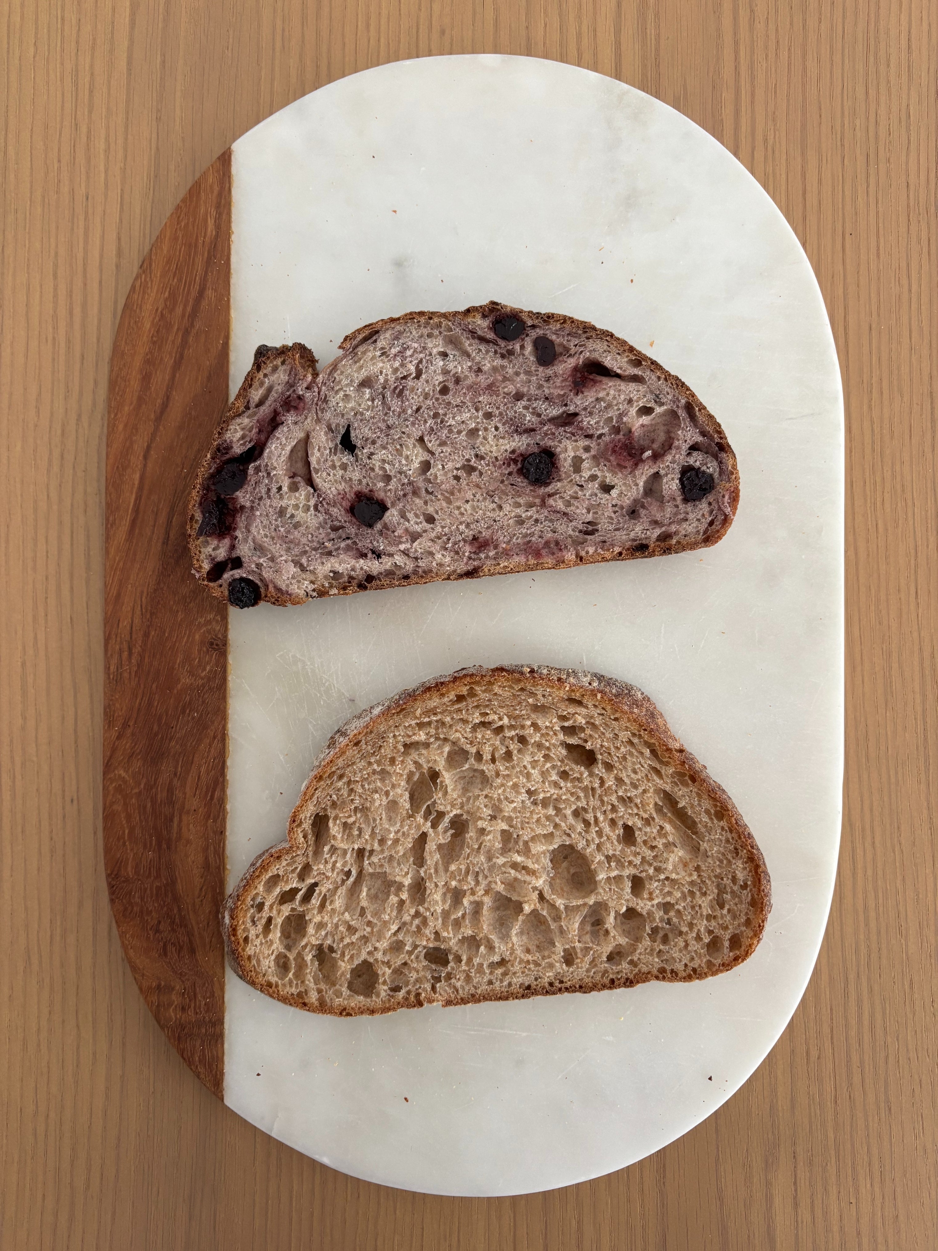 Costco has officially entered the sourdough game. Patty is a food and drink writer/editor whose work has appeared in Eater, Food Network, The Kitchn, and more. Slice of Costco's Kirkland Signature Blueberry Sourdough Bread on top and Whole Foods Market's Heritage Grain Sourdough Boule on the bottom.