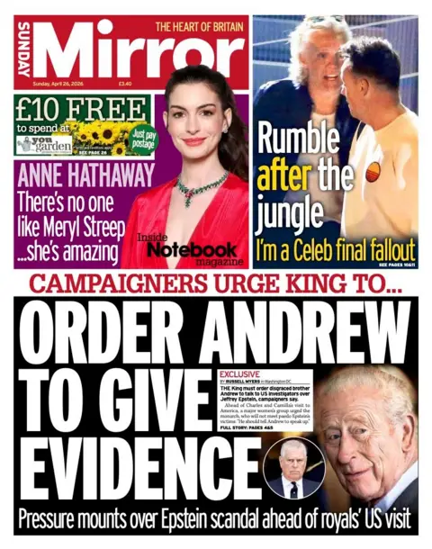 The Sunday Mirror says the King is coming under increasing pressure to order Andrew Mountbatten-Windsor to give evidence to US officials investigating Jeffrey Epstein. Campaigners have urged Charles to tell his brother to "speak up", according to the report. Mountbatten-Windsor has always denied any wrongdoing related to Epstein's crimes. The King's state visit to the US is due to begin tomorrow.