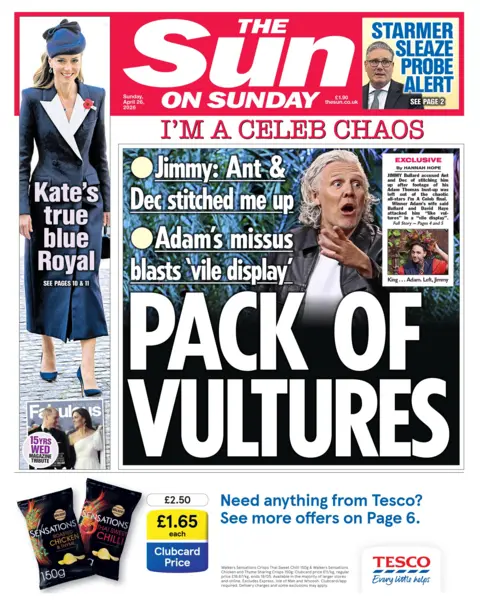 The Sun on Sunday focuses on what it calls the "I'm a celeb chaos" of the live final in which arguments broke out between some of the contestants. The former footballer, Jimmy Bullard, has accused the programme's presenters, Ant and Dec, of "a stitch up", after footage of his argument with the eventual winner, Adam Thomas, was edited out. The Daily Star's front page features a picture of Bullard with Ant and Dec, who it says were surrounded by security. The headline reads: "I'm a celebrity host, get me out of here, quick".