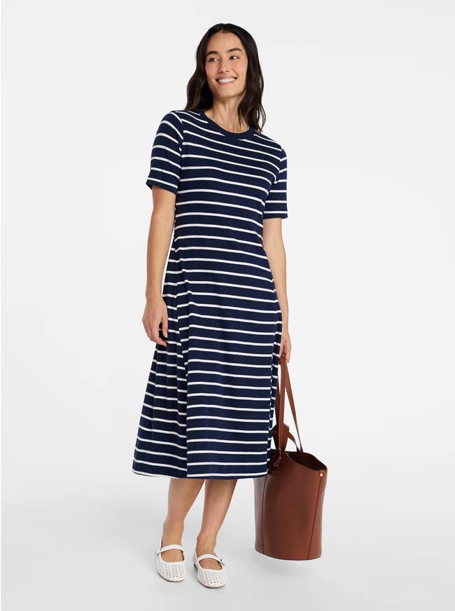 Promising review: “Nice fabric — no stretch, but the design and details are stunning and so cute. I'm bringing this on my April cruise for a casual dinner dress. It's probably going to wrinkle, but I'm willing to bet I can steam it. It's the ideal spring-cruise dress in nautical navy blue. I'm apple-shaped, and this cut dress actually gives me a waist! Buy it now!” —Jill
