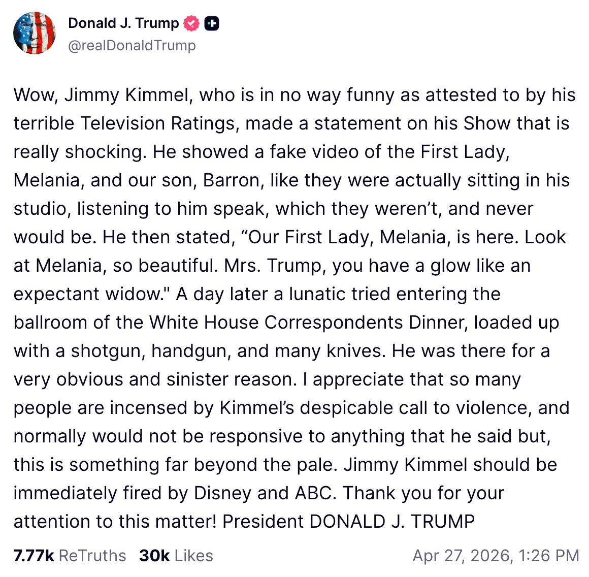 Melania accused Kimmel of spreading “hate,” something which the president has never done.
