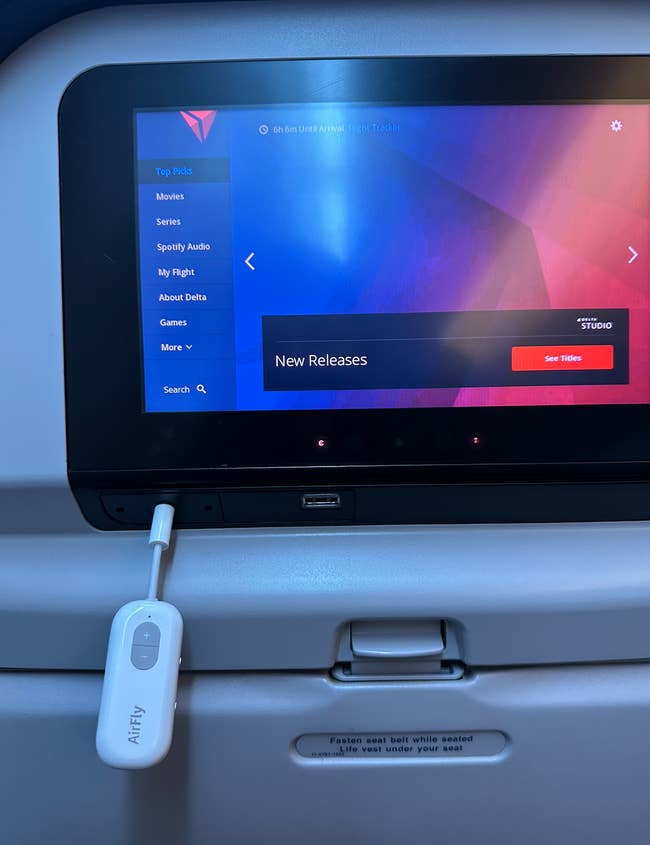 Isn't it wild that in the year of 2026 we have robots trying to do dishes or fighting in boxing matches before airlines have TV screens on flights with Bluetooth capabilities? ...I know, a mess. But alas, here we are. And to be on an 8- to 11-hour flight with corded headphones just feels so archaic and wrong. Not to mention that if you end up in the dreaded middle seat and the window person has to go to the bathroom every 20 minutes, it will def become v annoying to be constantly unplugging them. So, lemme put you on to the Airfly wireless transmitter that will give you all the Bluetooth freedom that you crave by just plugging it into the headphone jack! It also comes with a USB-C charging cable, travel pouch, and keychain holder to make keeping track of it a breeze.