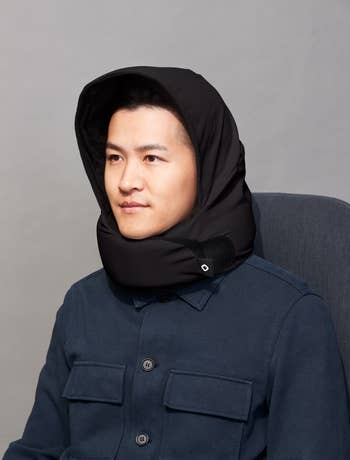 Now, whether you have first-class seats or economy, sleeping on a flight can still be a torturous hell because it's not your bed. But if you're gonna be on a v long flight, as well as changing time zones, it only makes sense to try and get some shut eye so you can better acclimate to the time changes when you land. That's why a Pluto Pod just might be the best investment. It's a specially designed travel pillow that basically creates your own little sleep cocoon with built-in neck support, a hood, and even an eye mask to block out the chaos around you. I have to say, not only is it super chic-looking, but it's also very compact and can be easily attached to your suitcase for simple transportability.
